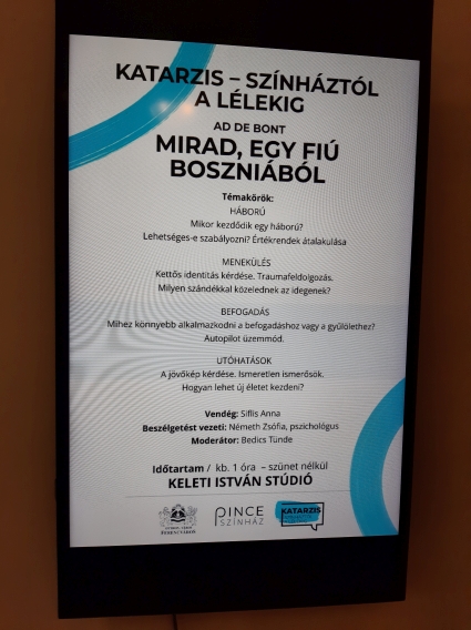 2023. február 26-án a végzős történelem tagozatos tanulók egy része megtekintette a Mirad, egy fiú Boszniából című darabot a Pinceszínház rendezésében. A darab egy szétszakított család történetén keresztül mutatta be a délszláv háború valóságát. A megtekintést követően a tanórán feldolgoztuk a látottakat. Az előadás bár egyórás volt, mégis a megdöbbentő rendezés, a történetvezetés fordulata és a modern technikai hatások mély nyomokat hagytak mindenkiben. Katarzist, vagyis megtisztulást éltünk át, amely kérdések sokaságát vetette fel, például hogyan éli át egy gyermek a háború borzalmait, ki számít menekültnek, vagy éppen hogyan változik a személyiség és módosulnak emberi kapcsolataink egy trauma hatására.